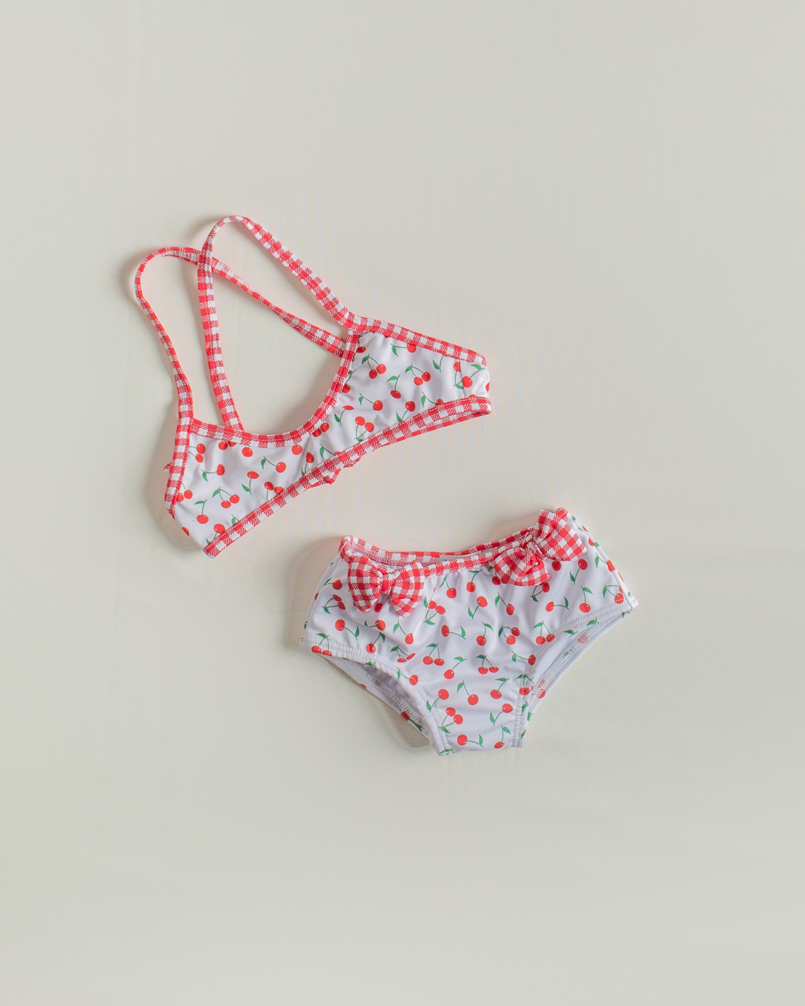 Biquini estampa cerejinha com detalhes e laços em xadrez e alça com regulagem,