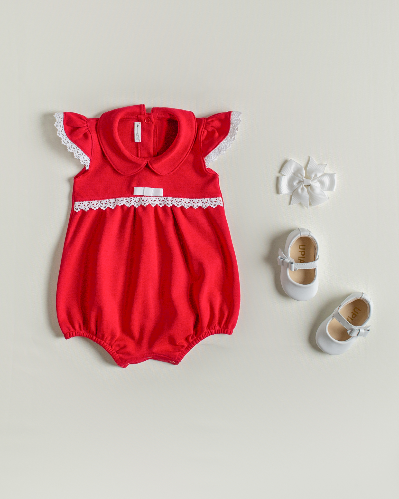 Macacão curto 100% suedine com detlahe guipir, possui abertura entre pernas.