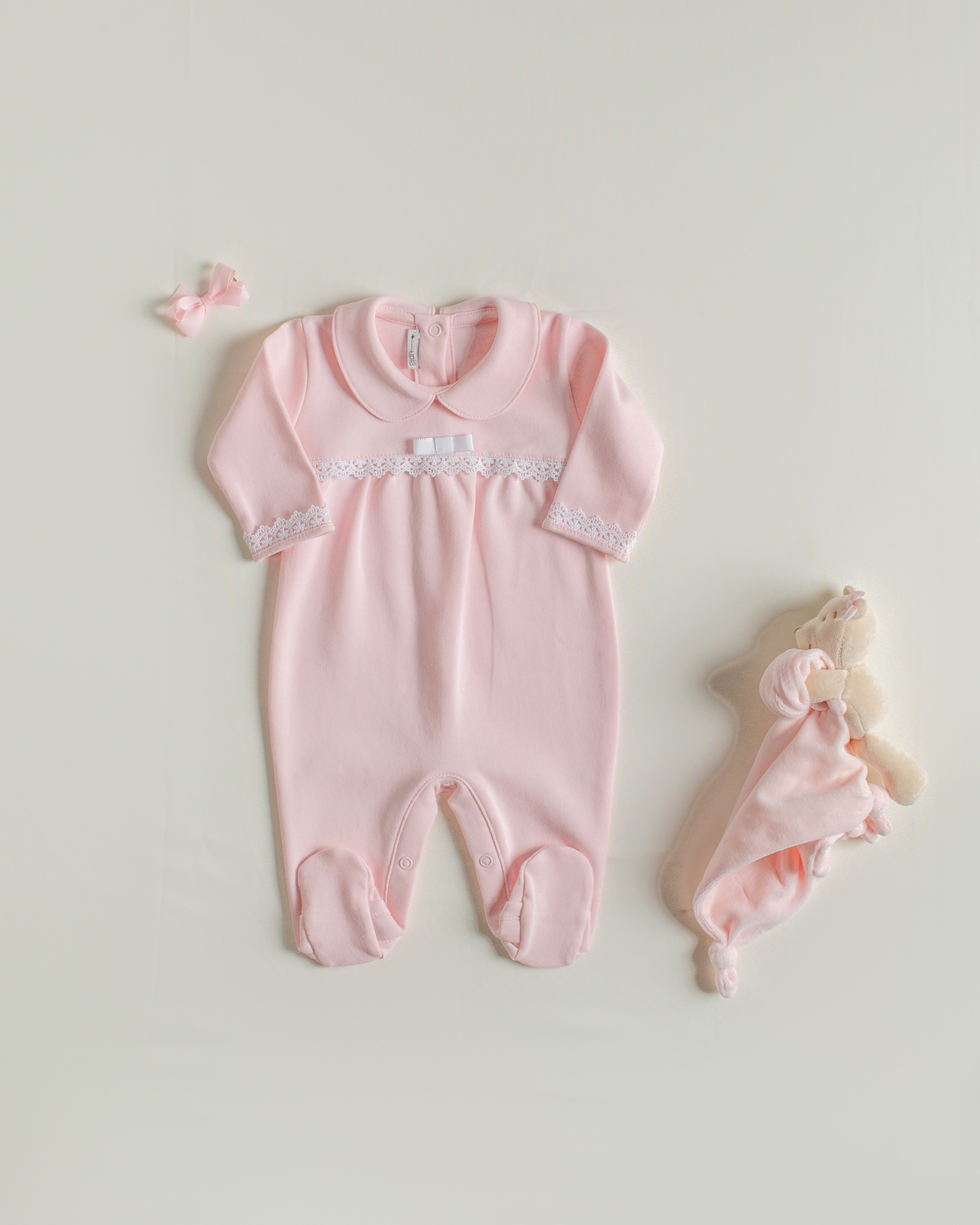 Macacão longo com guipir no peito e no acabamento das mangas, possui abertura entre pernas.