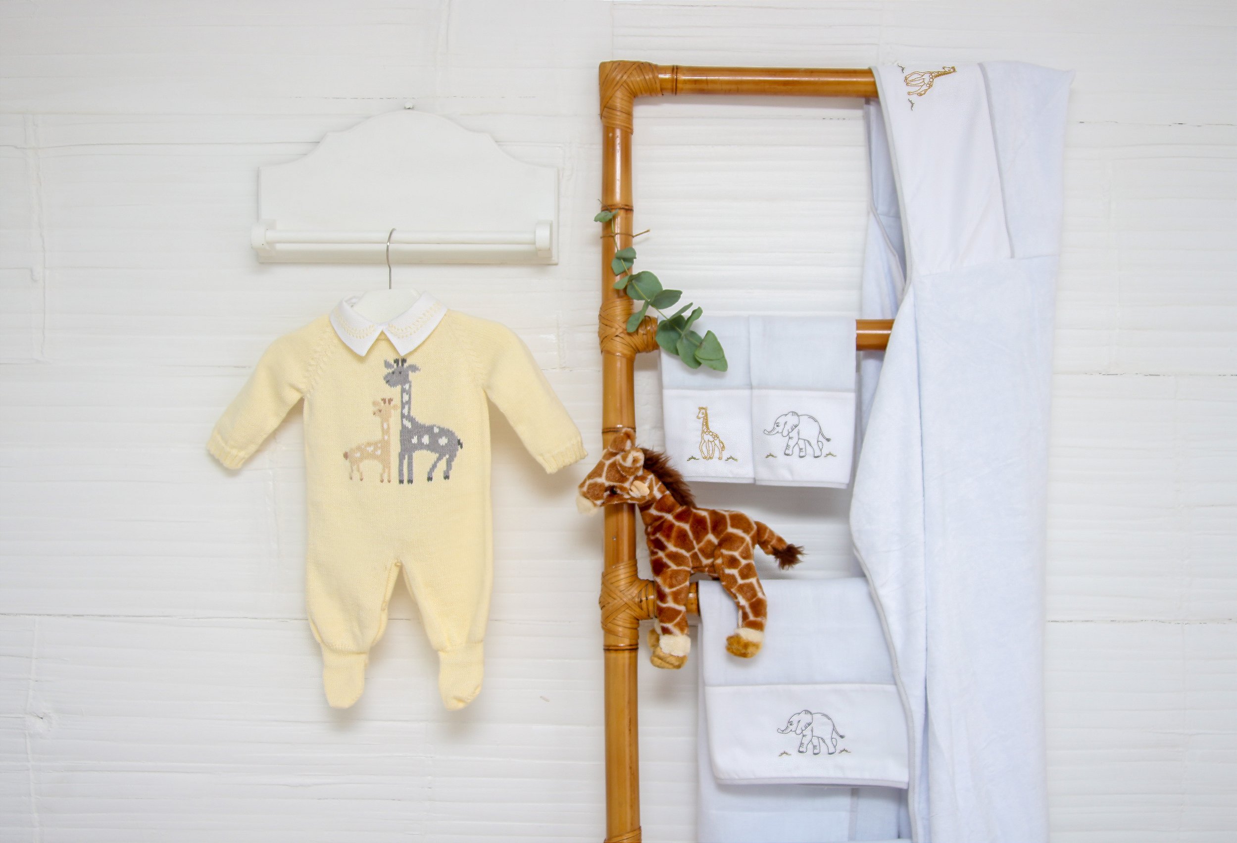 Macacão em tricô artesanal com girafas bordadas à mão, abertura entre pernas por botões e na parte de trás,