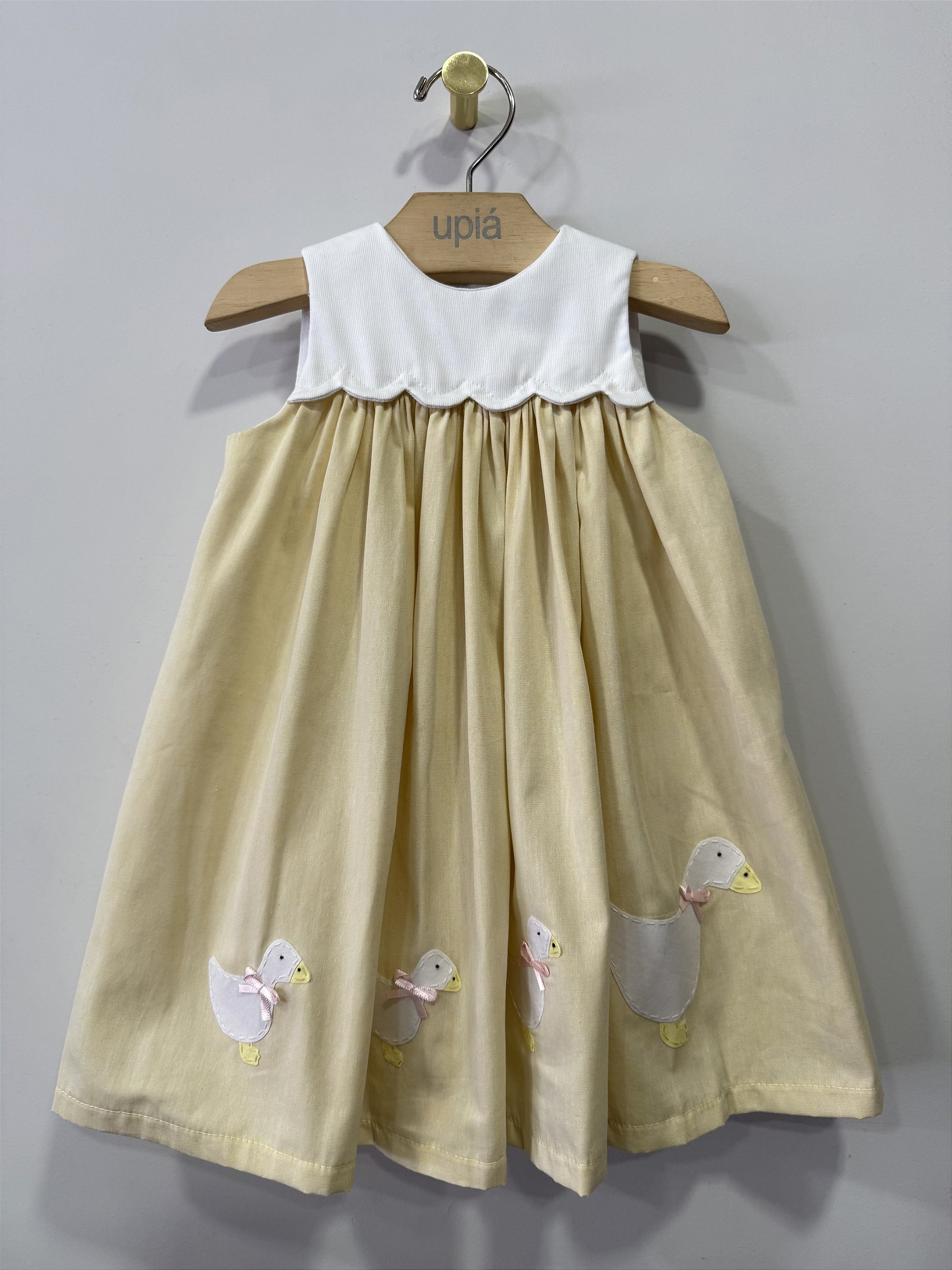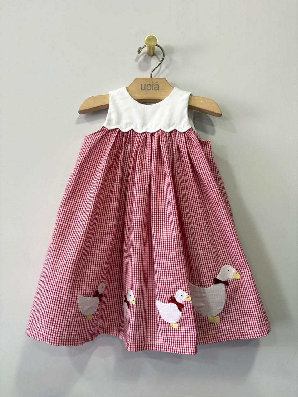 Vestido 100% algodão, pala em fustão cotelê e corpo em chambreé de algodã, com patinhos aplicados à mão.